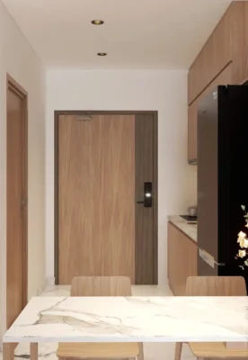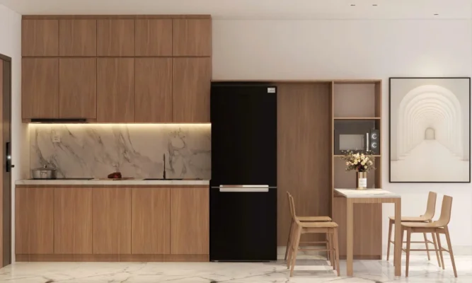 | Khu bếp | Tủ bếp trên – dưới, mặt đá nhân tạo, bồn rửa + bếp từ âm | Cốt MDF chống ẩm, phụ kiện inox 304 | Thiết kế dạng chữ L tối ưu công năng |