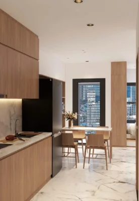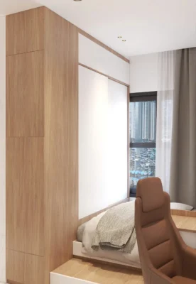 Thi công nội thất Căn hộ 1 phòng ngủ được thiết kế theo tinh thần “Less is More” – giảm chi tiết, tăng công năng.