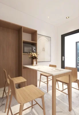 | Khu ăn + trang trí | Bàn ăn 4 ghế, vách trang trí + gương ốp tường | Gỗ – kính – pha màu xanh pastel | Tạo độ thoáng và phản chiếu ánh sáng |