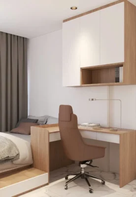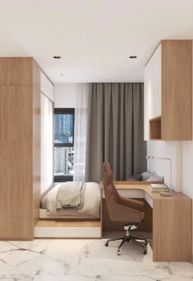 | Phòng ngủ | Giường 1m6 × 2m, tủ áo 2 cánh, bàn làm việc – tab đầu giường | MDF chống ẩm An Cường, ray giảm chấn Blum | Tận dụng chiều cao kịch trần |